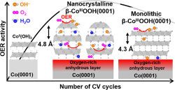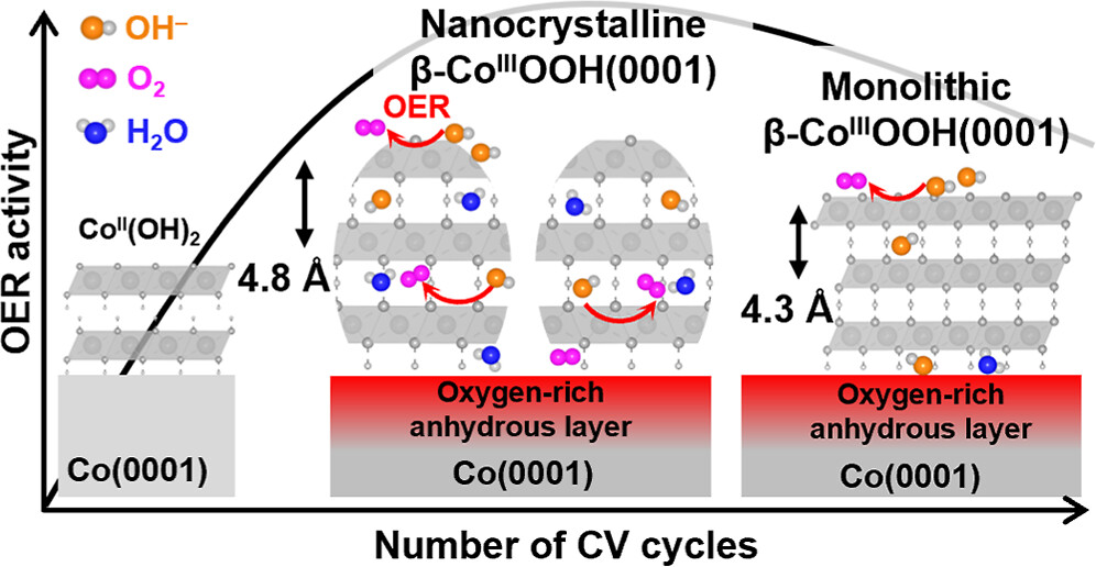 We unveil that in situ generated thin ß-CoOOh(0001) layer undergoes dynamic morphological and elemental changes along with (de)incorporation of water molecules and hydroxyl groups during OER, which in turn alters OER perfomance.