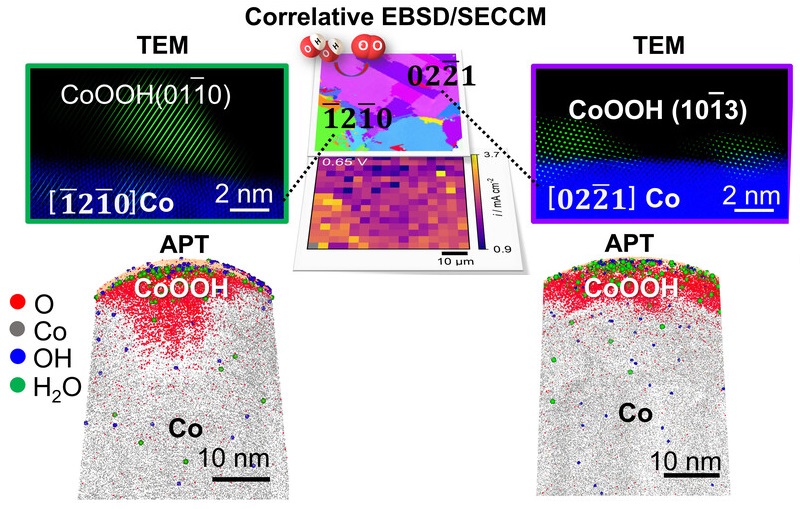 Our correlative multimodal approach can link local activity with atomic-scale details of structure, morphology and composition of surface species formed during the oxygen evolution reaction (OER). We found that 6 nm β-CoOOH(01-10) layer, grown on [-12-10]-oriented Co, contains more hydroxyl ions and easily reducible CoIII-O sites, exhibiting a higher OER activity than 3 nm thick β-CoOOH(10-13) formed on [02-21]-oriented Co.