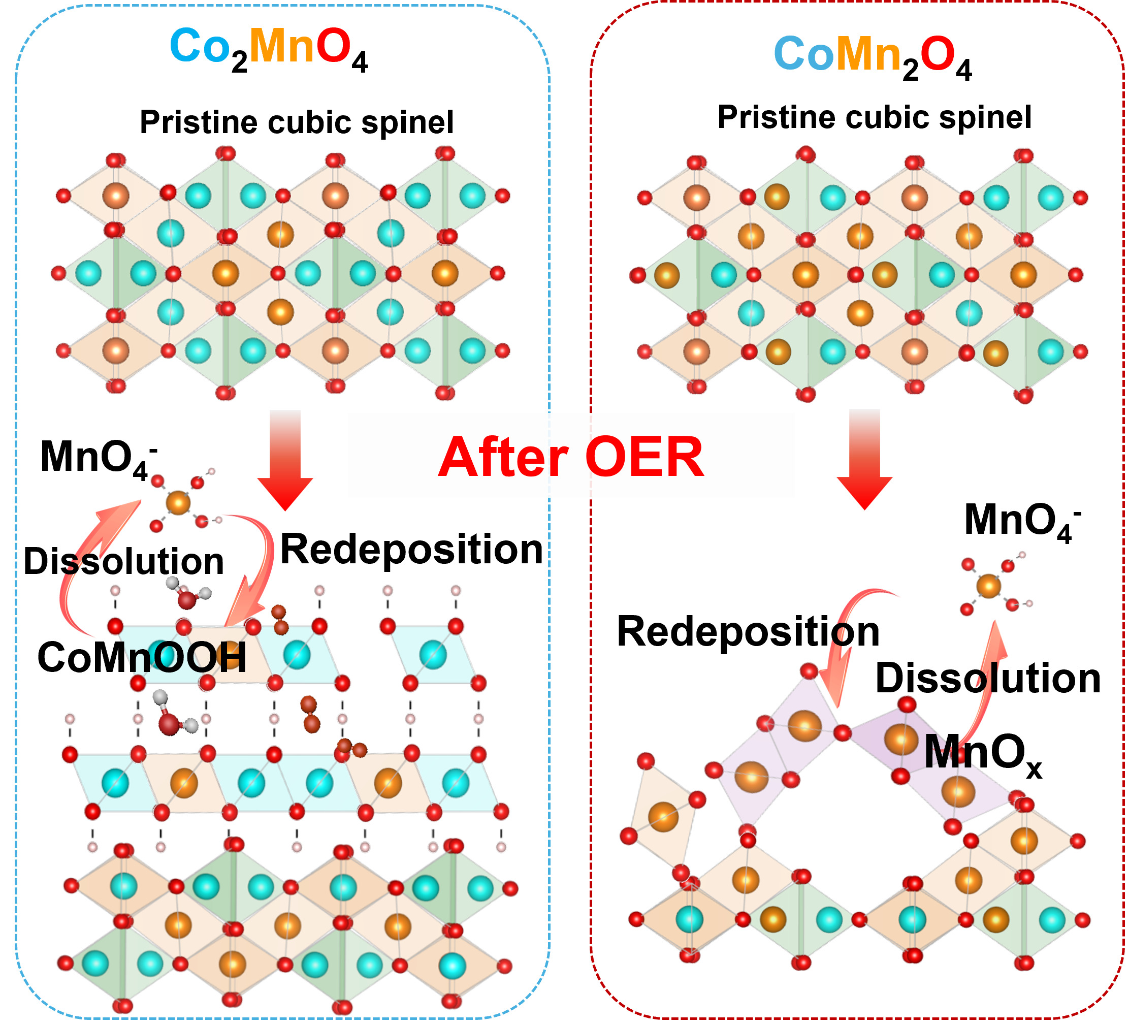 This study uses a multimodal approach to investigate how Co2MnO4 and CoMn2O4 electrocatalyst surfaces dynamically reconstruct and transform during the oxygen evolution reaction (OER). The findings reveal that Co2MnO4 forms Co-Mn oxyhydroxides with an optimal Co/Mn ratio, which enhances OER stability through Mn dissolution and redeposition, while CoMn2O4 forms less active Mn-rich oxides during the process.