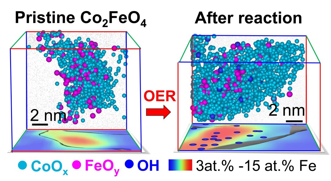 We use atom probe tomography to elucidate the 3D structure of 10 nm sized Co2 FeO4 and CoFe2O4 nanoparticles during oxygen evolution reaction (OER). We reveal nanoscale spinodal decomposition in pristine Co2FeO4.