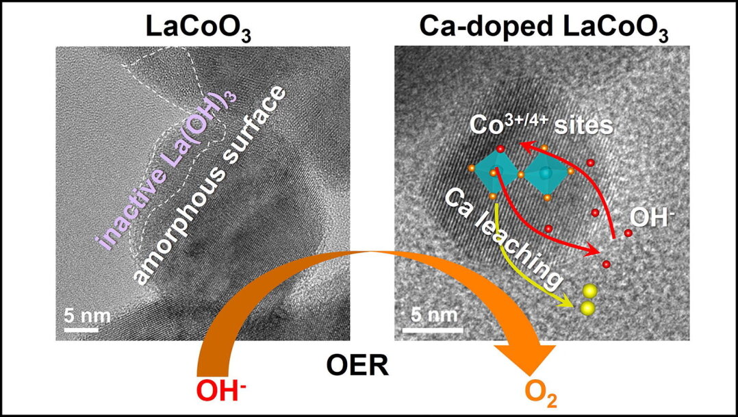 To develop efficient oxygen evolution reaction (OER) electrocatalysts, we used atom probe tomography and transmission electron microscopy to analyze LaCoO3 and Ca-doped LaCoO3 surfaces. Our findings reveal that while LaCoO3 surfaces deteriorate after OER due to the formation of amorphous La(OH)3, Ca-doped LaCoO3 shows enhanced OER activity and stability due to increased hydroxide ion intercalation and the appearance of a Co 3+/4+ redox couple.