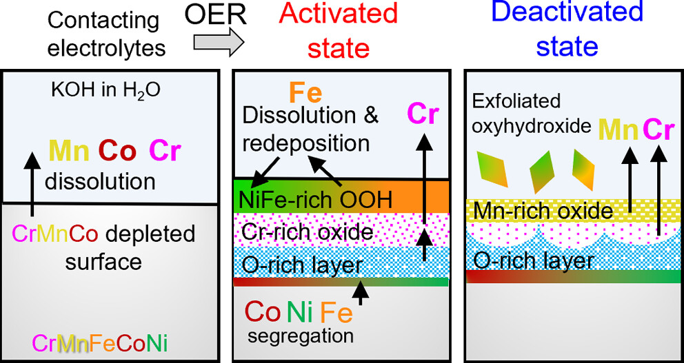High-entropy alloys (HEAs) are promising for oxygen evolution reaction (OER) electrocatalysts, but understanding their surface and subsurface changes during OER is key to improving performance. Our study reveals that the CrMnFeCoNi Cantor alloy undergoes dissolution and complex layer formation during OER, leading to activity deterioration, highlighting the importance of structure–activity–stability relationships in HEAs.